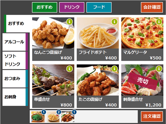 お客様が商品の写真を見ながら簡単に注文ができます。写真のサイズはカテゴリごとに本部システムで設定可能です。店舗独自にメニューの見せ方にカスタマイズもできます。