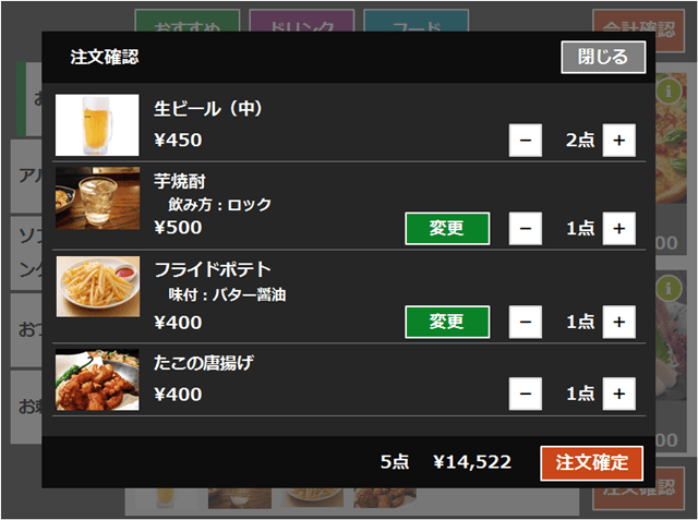 お客様が注文する商品の確認を行います。注文確定したらキッチンプリンタ・キッチンタブレットに注文情報が印刷・表示されます。