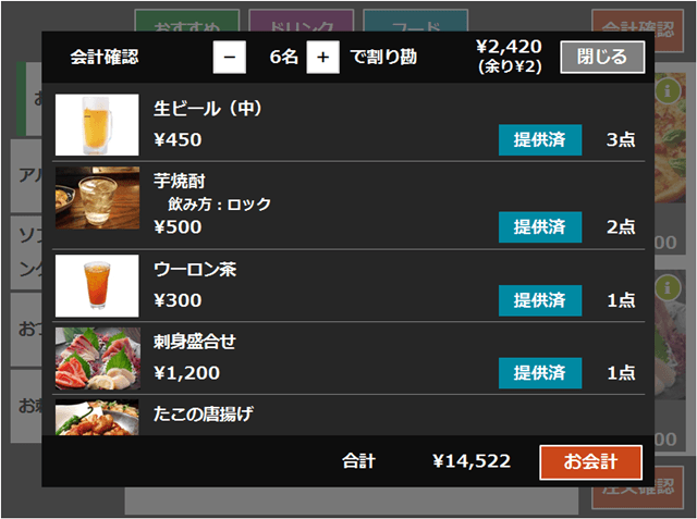 注文内容、割引、チャージ料から計算した会計金額を確認できます。商品が提供済みかも確認できます。 会計金額を割り勘した金額も簡単に計算できます。